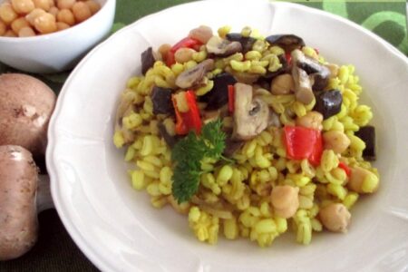 Ingredienti 300 g orzo perlato 150 ceci già cotti (circa 50 secchi) 2 cucchiaini olio extravergine di oliva 1 cipolla 1 spicchio di aglio 1 melanzana 1 peperone 200 g di funghi 1 limone non trattato in superficie possibilmente bio 1 cucchiaino di cumino in polvere mezzo cucchiaino di paprica dolce mezzo cucchiaino di zenzero in polvere 1 cucchiaino di curcuma in polvere prezzemolo sale e pepe q.b. Procedimento …